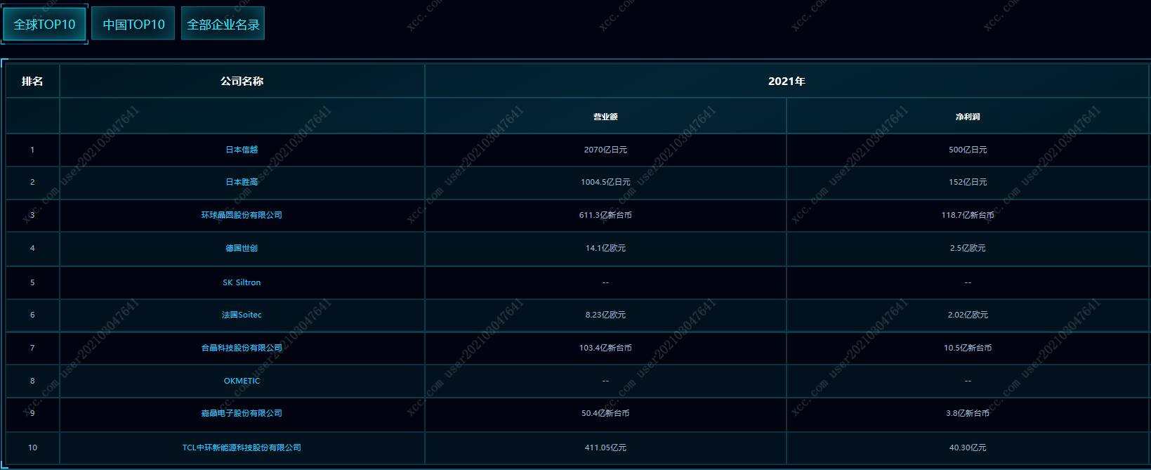 芯查查企业SaaS产业链图谱各领域厂商最新排名中,全球硅晶圆排名前十位的企业为:日本信越、日本胜高、环球晶圆股份有限公司、德国世创、SK Siltron、法国Soitec、合晶科技股份有限公司、OKMETIC、嘉晶电子股份有限公司和TCL中环新能源科技股份有限公司(如下图)。