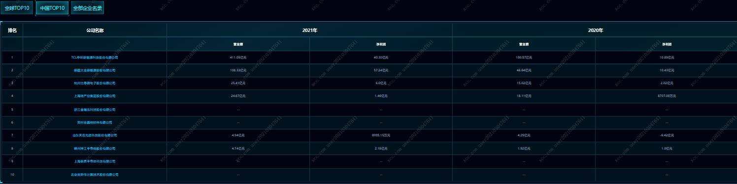 芯查查企业SaaS产业链图谱每周更新各领域厂商排名,国内硅晶圆企业排名前十位的企业为:TCL中环新能源科技股份有限公司、新疆大全新能源有限公司、杭州立昂微电子股份有限公司、上海硅产业集团股份有限公司、浙江金瑞泓科技股份有限公司、郑州合晶硅材料有限公司、山东天岳先进科技股份有限公司、锦州神工半导体股份有限公司、上海新昇半导体科技有限公司和北京奕斯伟计算技术有限公司(如下图)。