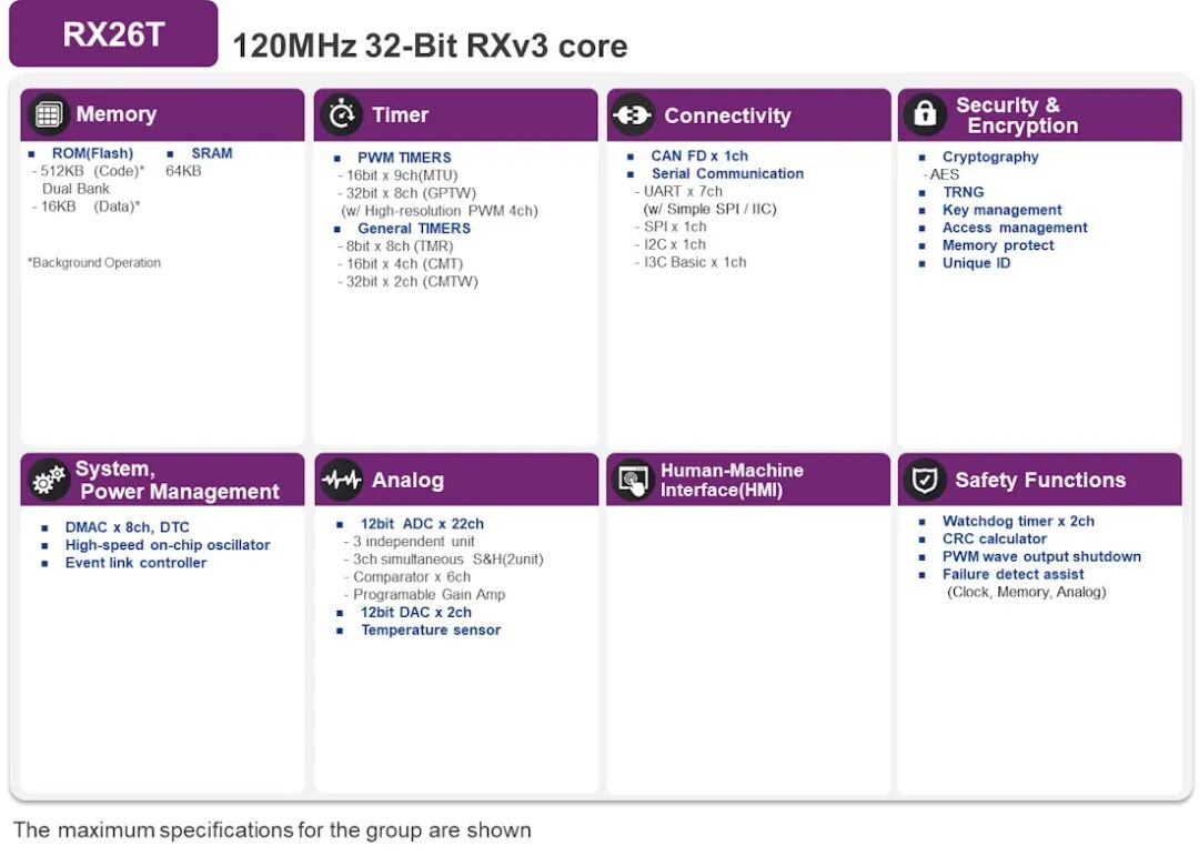 - 搭载120MHz的CPU RXv3 内核 (721CoreMark)