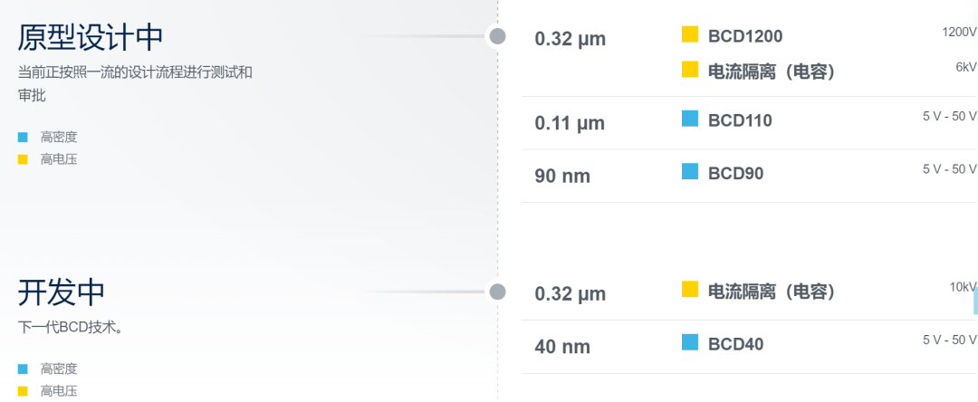 此外,还有耐压至5V~50V的90nm BCD90工艺平台正在进行测试和审批,以及下一代40nm的BCD40nm工艺与高电压0.32微米的电流隔离(电容)10kV平台在开发当中。