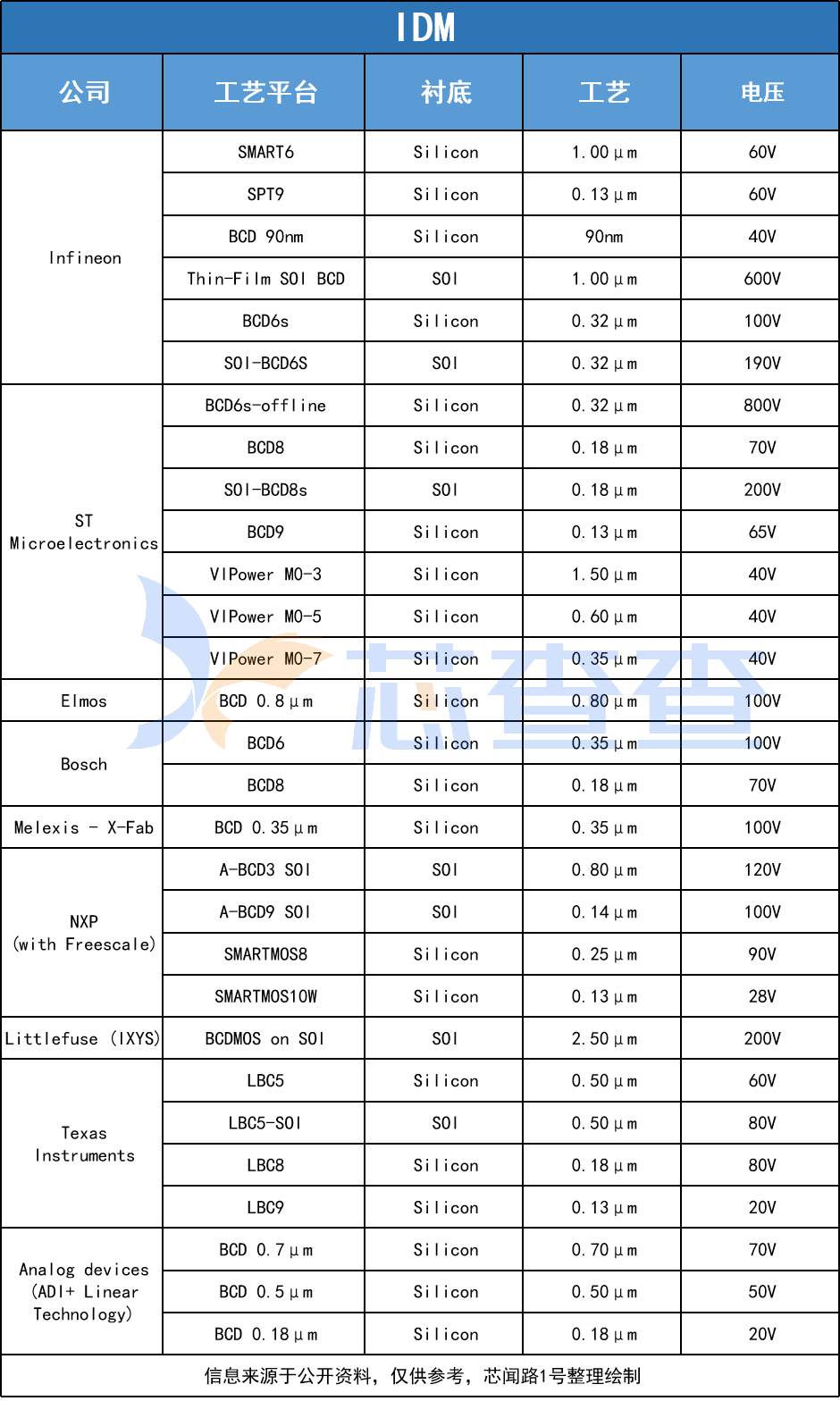 目前BCD工艺技术水平最好的基本都是欧美公司,而且主要以设计、工艺制造为一体的IDM模式为主,其次为日本、韩国,中国台湾和大陆的代工企业。