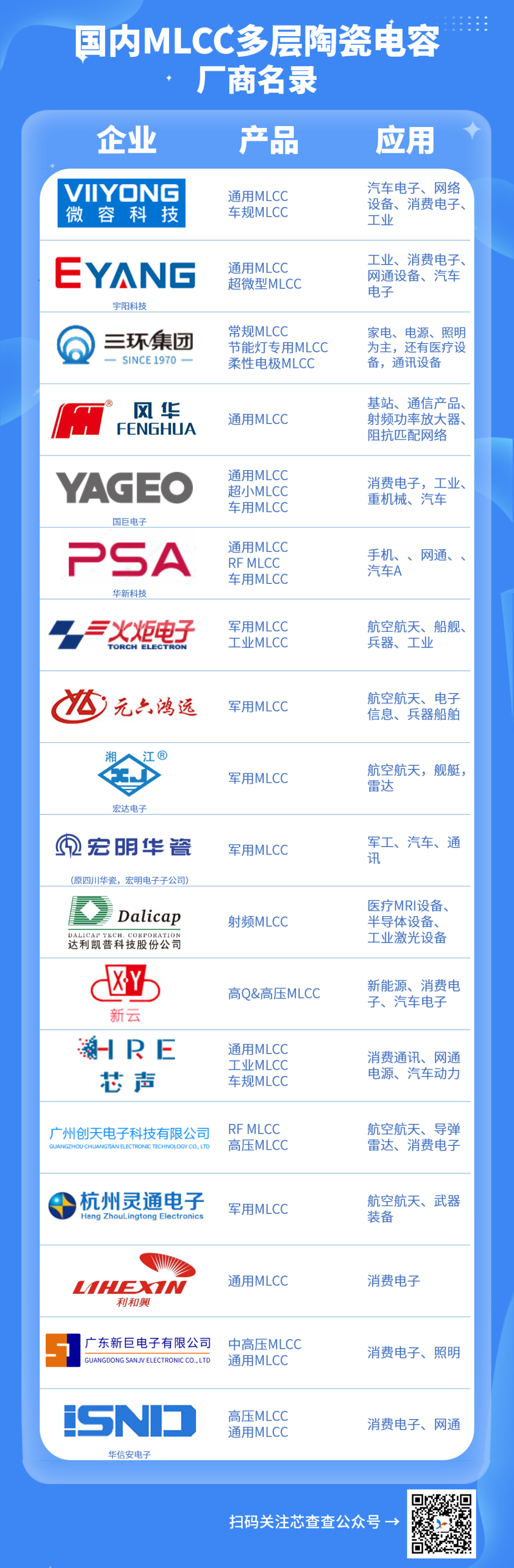 本期推文简要地盘点国内做MLCC片式多层陶瓷电容企业,如以下名录有所遗漏,欢迎到芯查查公众号后台留言补充。
