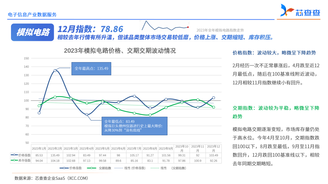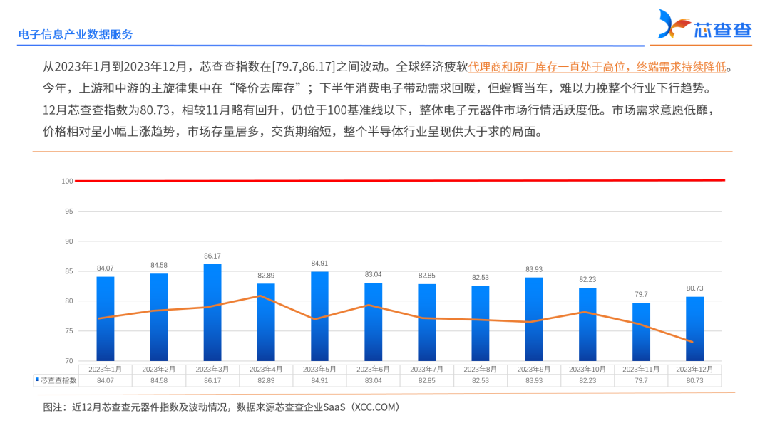 先说结论 :芯查查元器件指数全年在[79.7,86.17]之间波动,12个月份没一个上100基准线的 (100以上说明比去年行情好,100以下说明不如去年) 整体大盘全年比2022年行情差。进一步细分的看七大类元器件,光电器件、逻辑电路市场行情跌中有涨,整体向上;微处理器、存储器、分立器件不如去年行情;传感器、模拟电路相对稳定。