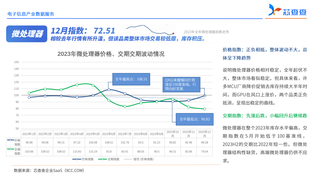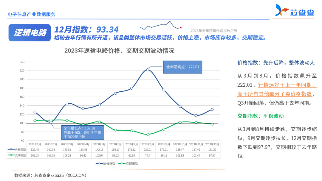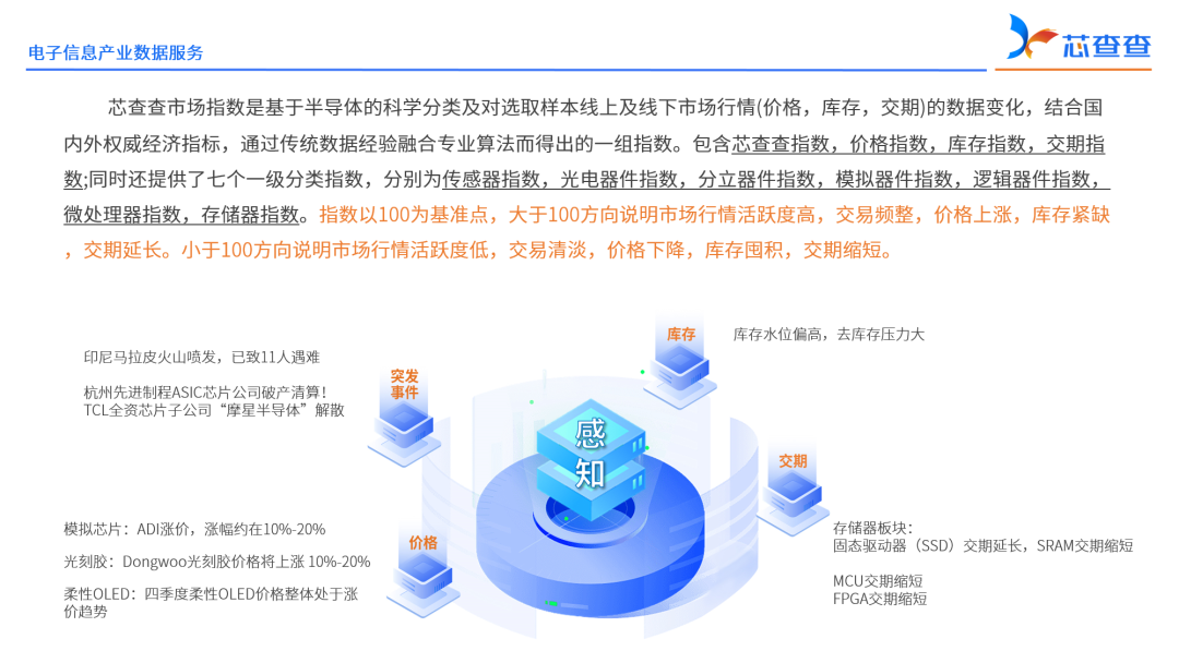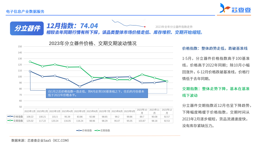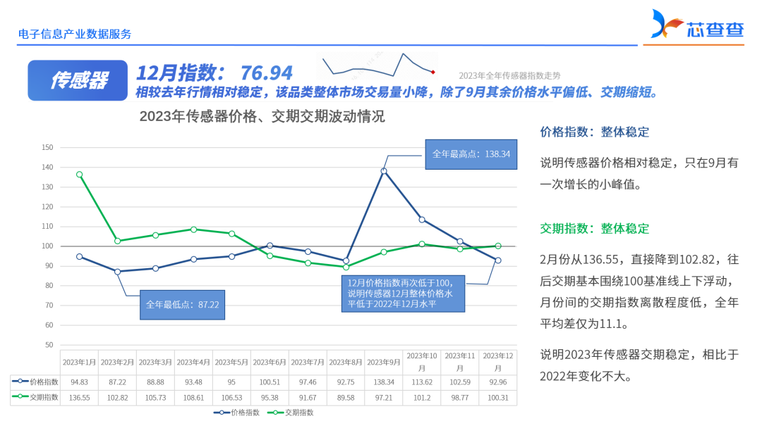 都说2023年行情不如2022年,但具体是差了多少,用数据才能看得清楚。本篇报告运用芯查查指数分析半导体市场整体行情,包括 传感器、存储器、分立器件、光电器件、逻辑电路、模拟电路、微处理器 7大类元器件的细分指数分析和2023年1-12月的全年价格&交期概览。