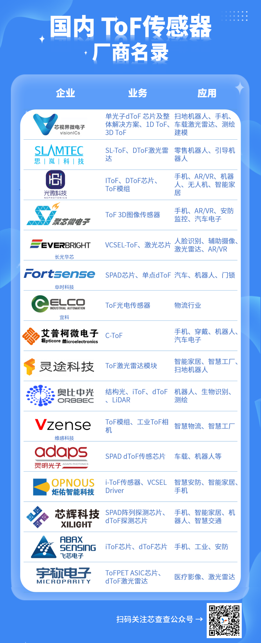 ToF(Time of Flight)传感器利用光(一般是红外线,约850纳米)或发射的声音(超声波)"飞 "到物体上并反射的时间来测量距离。 本期推文简要地盘点国内做ToF传感器企业,如以下名录有所遗漏,欢迎到芯查查公众号后台留言补充。