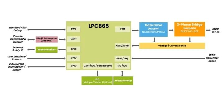 该试点项目旨在用无刷直流电机 (BLDC) 替换传统的同步交流电机和8位MCU。此外,该设计还采用了模块化的方法,保障成本效益。该试点设计使用了恩智浦LPC865 MCU、Nexperia BUK9Y43-60E MOSFETS于三相桥,以及On Semiconductor的NCD83591MNTXG栅极驱动器。