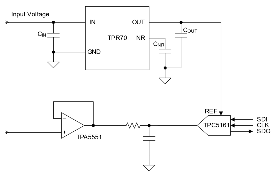 TPR70全系列产品可以保证±10mA的输出电流能力,其输出可以不经过运放直接给到ADC作为基准电压。下图是TPR70的典型应用电路图,输出电容支持0.1μF~100μF,NR脚接10nF以上的电容对地,可以进一步减小TPR70的输出电压噪声。