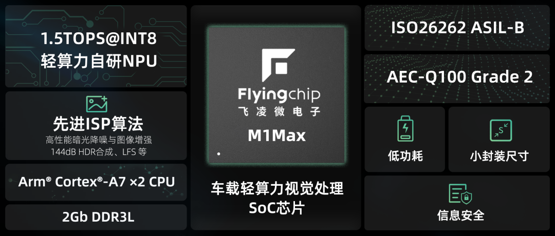 相较于M1Pro, M1Max在核心模块配置方面进行了相应升级,包括1.5TOPS@INT8轻算力自研NPU、Arm® Cortex®-A7 ×2 CPU、2Gb DDR3L内存等,以更强劲的处理和计算性能,进一步满足智驾系统在端侧的视觉处理应用需求。
