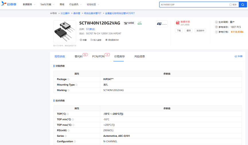 ST的SCTW40N120G2VAG系列SiC MOSFET是车规级产品,其导通电阻典型值为75毫欧,最大为105毫欧,栅极阈值电压最小为1.9V,最大5.0V,击穿电压为1200V,连续漏极电流Id为33A,工作结温为200℃,工作温度范围为-40℃~175℃。具有低栅极电荷和输入电容,快速恢复本征体二极管,符合AEC-Q101标准等特性,可用于主逆变器、车载充电机、DCDC转换器等应用。