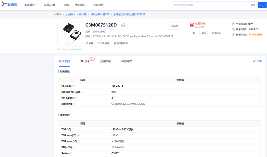 根据芯查查查询到的数据信息,Cree子公司Wolfspeed的C3M0075120D系列SiC MOSFET的导通电阻为75毫欧,栅极阈值电压最小为1.8V,最大3.6V,击穿电压为1200V,连续漏极电流为32A,该系列有两种类型,常规型号工作温度范围为-55℃~150℃;车规级的C3M0075120D-A型号的工作温度范围为-40℃~175℃。