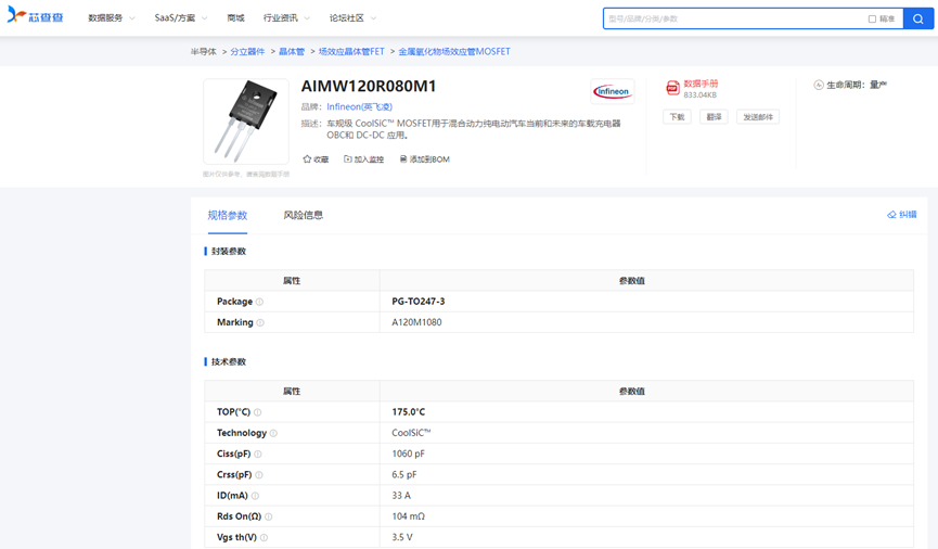 英飞凌的AIMW120R080M1系列SiC MOSFET是车规级产品,其导通电阻为80毫欧,栅极阈值电压最小为3.5V,最大5.7V,击穿电压为1200V,连续漏极电流Id为33A,工作温度范围为-40℃~175℃。具有低开关损耗、无阈值开启状态特性、与IGBT驱动电压兼容、与温度无关的关断开关损耗等特性,可应用于车载充电机/PFC、升压器、DCDC转换器等应用。