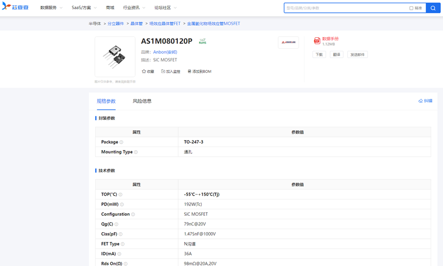 Anbonsemi的AS1M080120P系列SiC MOSFET导通电阻典型值为98毫欧,栅极阈值电压最小为2.0V,最大4.0V,击穿电压为1200V,连续漏极电流Id为36A,工作温度范围为-55℃~150℃。具有低导通电阻、低电容的高速开关、易于并联与驱动等特性,可用于电机驱动器、开关电源、高压DCDC转换器等应用。
