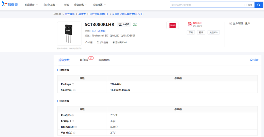 罗姆的SCT3080KLHR系列SiC MOSFET的导通电阻为36毫欧,栅极阈值电压最小为2.8V,最大4.8V,击穿电压为1200V,连续漏极电流为40A,工作温度范围为-40℃~175℃。具有低导通电阻、高开关速度、快速反向恢复、易于并联、驱动简单等特性,可应用于太阳能逆变器、DCDC转换器、开关电源等应用。