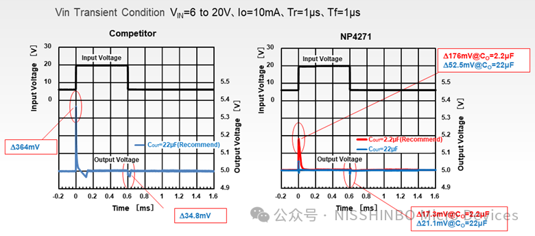 当电源线VIN上连接多个负载时,负载的工作状态可能会导致电源线波动,这样会影响到输出电压。NP4271系列的输入瞬态响应特性良好,能够抑制输出电压的波动,有助于系统稳定运行。