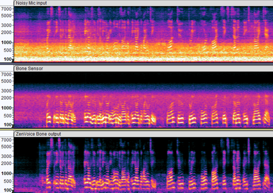 例如,下图频谱图展示了ZenVoice Bone在高噪声环境中的有效性,它在85db风噪声中隔离并重建最终用户的语音。