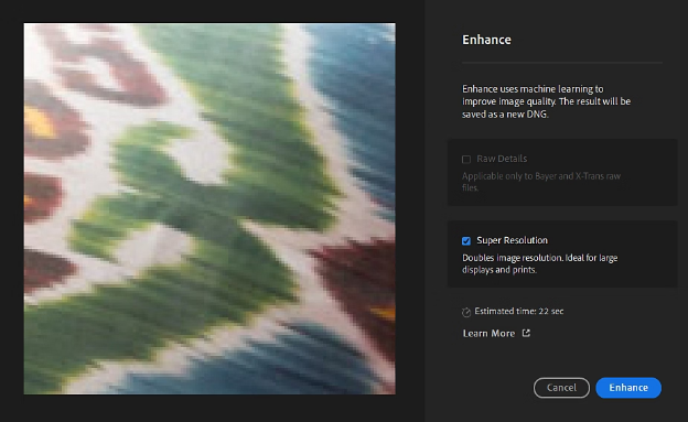 超分辨率有助于创建增强的图像,其结果与原始细节类似,但线性分辨率为后者的 2 倍。即增强后的图像的宽度和高度将是原始图像的 2 倍,或像素总量为原始图像的 4 倍。这对于提高裁剪图像的分辨率尤为有用。