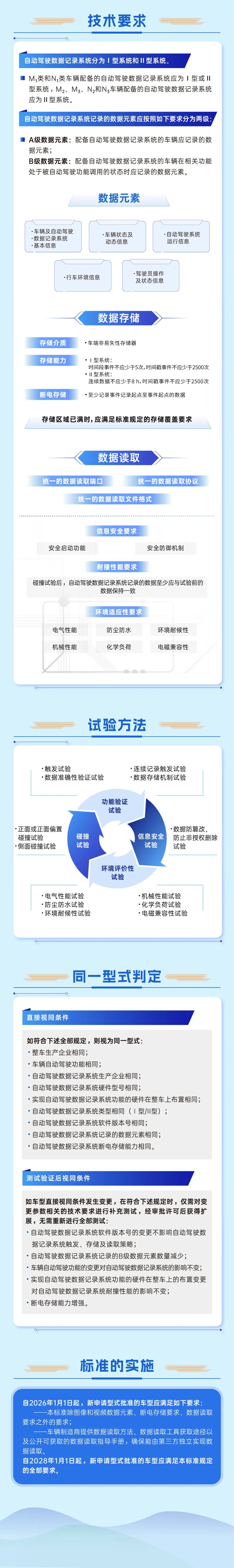GB 44497—2024《智能网联汽车 自动驾驶数据记录系统》规定了智能网联汽车自动驾驶数据记录系统的数据记录、数据存储和读取、信息安全、耐撞性能、环境评价性等方面的技术要求和试验方法,适用于M和N类车辆配备的自动驾驶数据记录系统,将为事故责任认定及原因分析提供技术支撑,有利于促进自动驾驶技术进步。