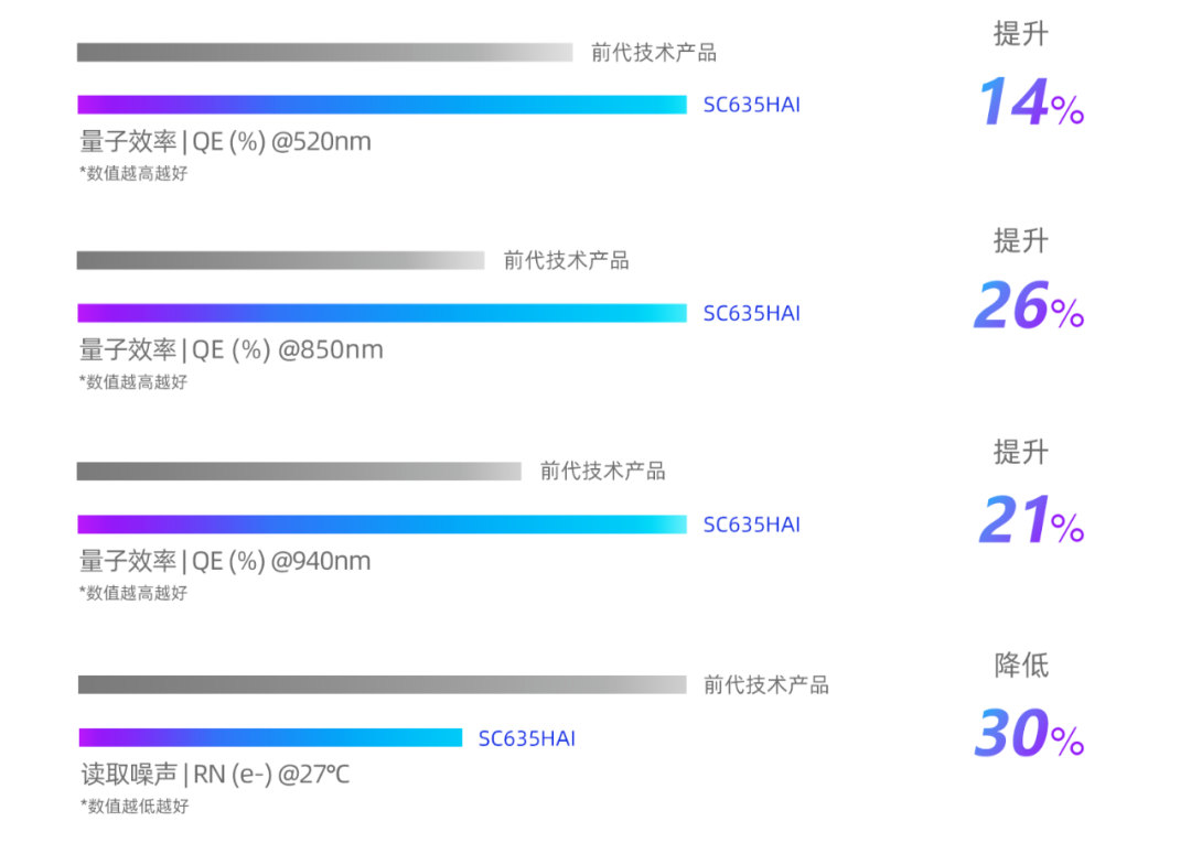 两款新品基于背照式像素架构设计,采用了思特威SFCPixel®专利技术和Lightbox IR®近红外增强技术,实现了可见光与近红外波段下优异的感光性能。相较前代技术产品,SC635HAI在520nm可见光波段下的量子效率(QE)提升了约14%,其在850nm波段和940nm波段下的QE分别提升了约26%和21%,同时其读取噪声(RN)和PRNU的降幅分别为30%和17%,即使在黑暗环境下也可为摄像头提供清晰明亮、低噪点的影像。