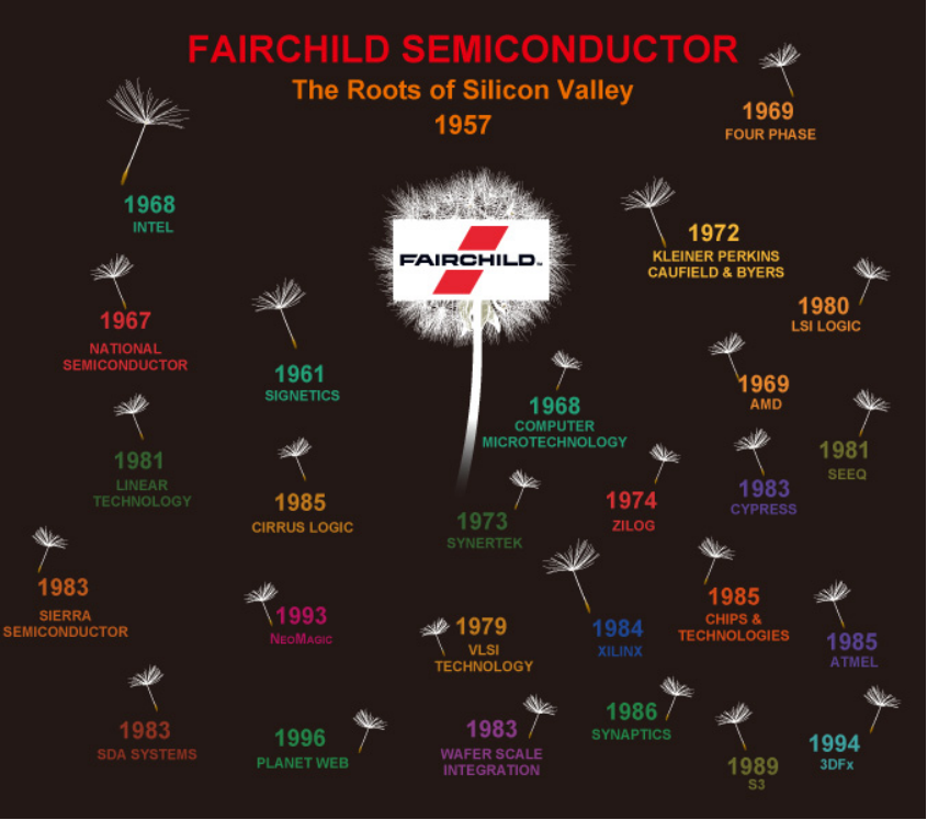 乔布斯曾这样形容:“仙童半导体公司就像一朵成熟了的蒲公英,你一吹它,这种创业精神的种子就随风四处飘扬了。”和仙童有着直接或间接的企业,例如AMD、英特尔、美国国家半导体、VLSI等,他们流淌着仙童的血脉,共同组成了今天的硅谷。