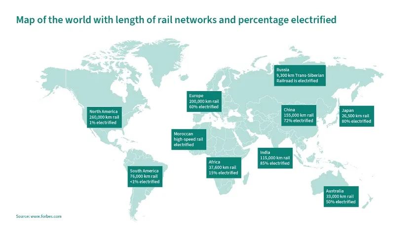图:轨道交通的电气化转型方兴未艾,世界不同国家和地区的电气化率有很大差异
