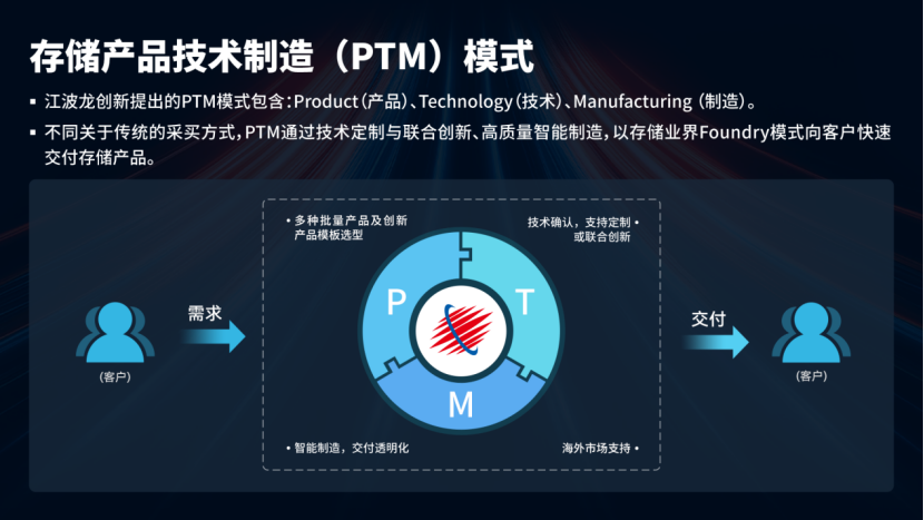今年,江波龙面向行业客户率先推出PTM(存储产品技术制造)模式,旨在通过技术定制与联合创新、高质量智能制造,以存储界的Foundry模式,为高端客户提供更具价值的全栈定制化服务,实现快速交付存储产品的目标。