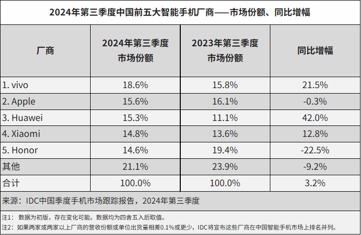 2024年第三季度五大智能手机厂商市场表现: