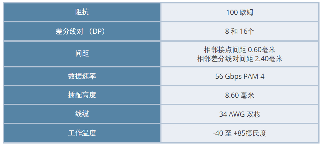相邻信号针0.60毫米的间距,相邻差分线对2.40毫米的间距。每平方英寸可以容纳30至50个差分线对,这种设计能在狭小空间内提供高数据速率传输,非常适合100欧姆的网络和top-of-rack(TOR)应用场合。