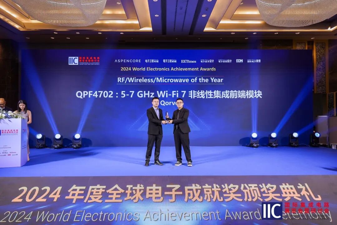 在2024第十一届中国IoT大会暨第九届中国IoT创新奖颁奖典礼上,Qorvo公司的“QPF4702:5 - 7 GHz Wi-Fi 7 中等功率非线性前端模块(FEM)”就荣膺了年度产品奖。这款产品也荣获ASPENCORE授予的2024年度全球电子成就奖——年度无线产品。这是对Qorvo在Wi-Fi技术方面不断追求进步的最大褒奖。