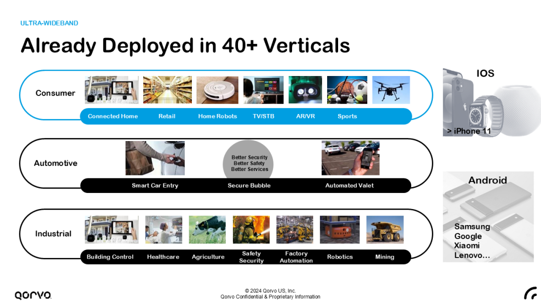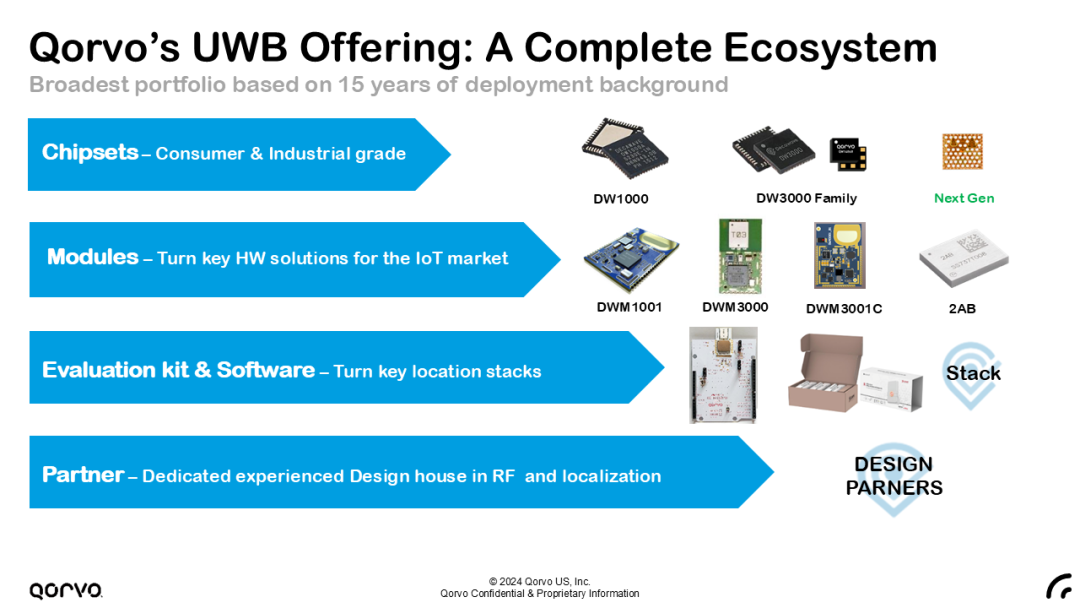 Qorvo是最早进入UWB行业的公司之一,已推出两代商用量产产品——DW1000系列和DW3000系列,并配套提供多种射频器件,如LNA和放大器。公司正在研发的第三代UWB产品也将很快面世,会持续引领UWB技术的发展。
