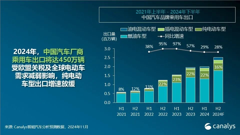 2024年下半年,中国汽车品牌乘用车出口量有望达到250万辆,全年总量将达450万辆,同比增长29%。受欧盟关税政策和新能源车需求下降的影响,中国纯电动车型出口增速将放缓至9%(86万辆),出口占比将从2023年的22.5%下降至2024年的19.0%。与此同时,插电混合动力汽车(PHEV)和油电混合动力汽车(HEV)的出口占比将实现三年来首次超10%,分别达到31万辆和24万辆。拉丁美洲和欧洲是推动中国汽车品牌插电混合动力汽车和油电混合动力汽车出口增长的主要区域。