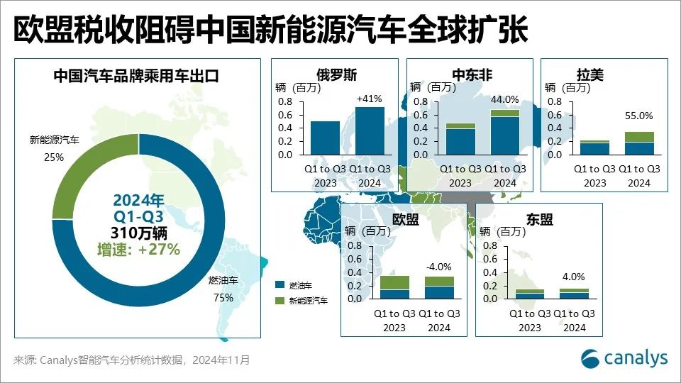 2024年前三季度,中国汽车品牌乘用车出口量增长27%,达310万辆。受欧盟对中国新能源汽车加征关税影响,欧洲是唯一出口量下降的区域市场,降幅为4%。随其他区域出口量增加,欧盟从2023年中国汽车品牌最大出口市场下降至2024年的第四大市场。