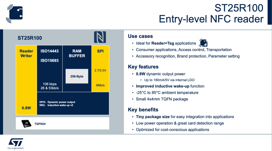 ST25R100入门级NFC读卡器主要特点是:0.8W动态输出功率,通过内部LDO高达180mA/5V;环境温度-25°C至85°C。