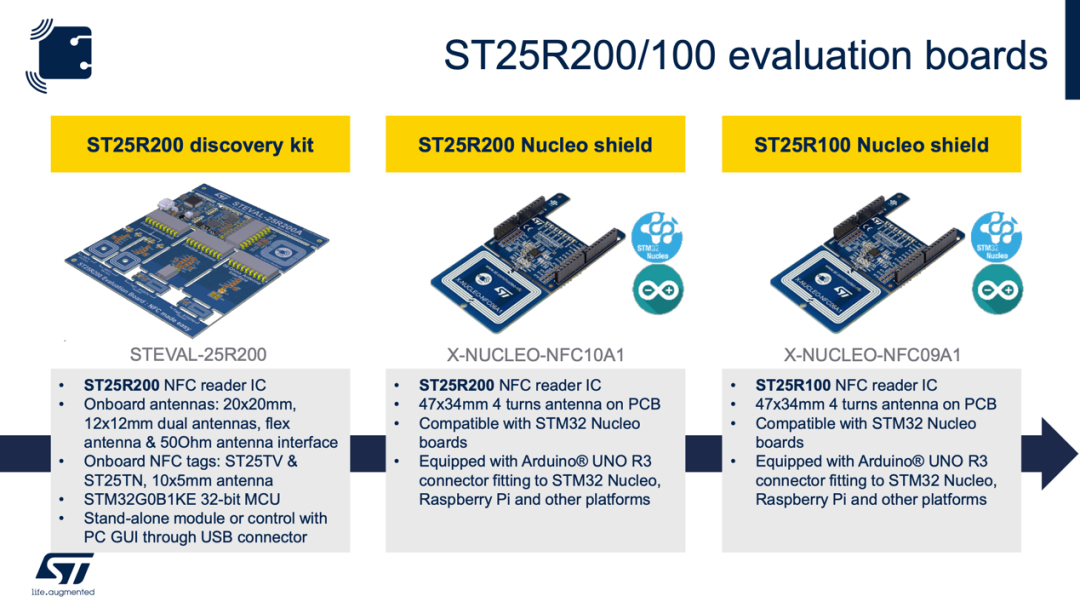 目前,ST已推出多款适用于ST25R200/R00读卡器的评估板:
