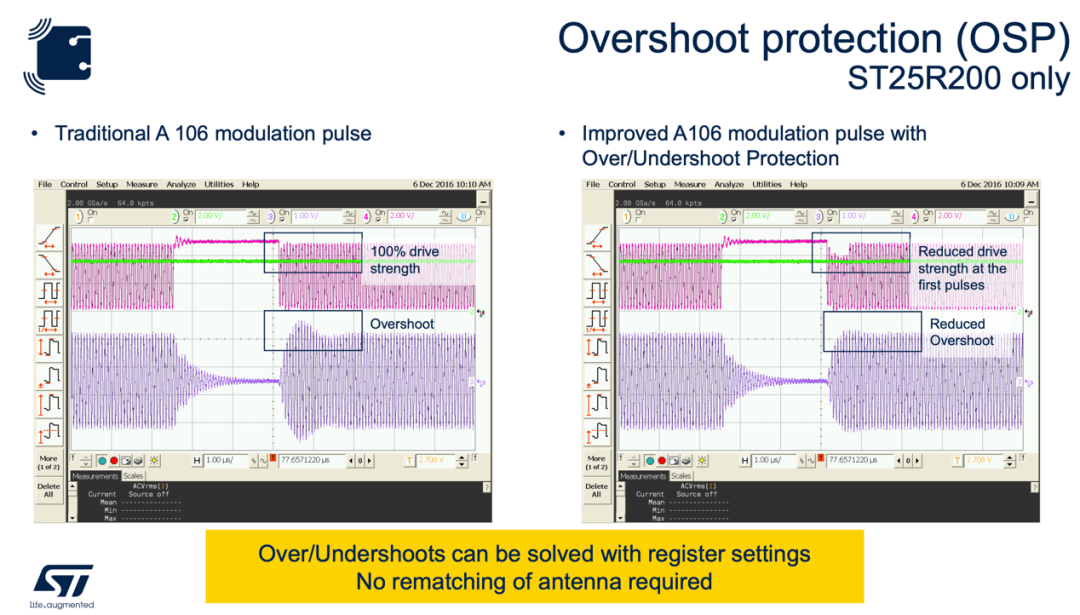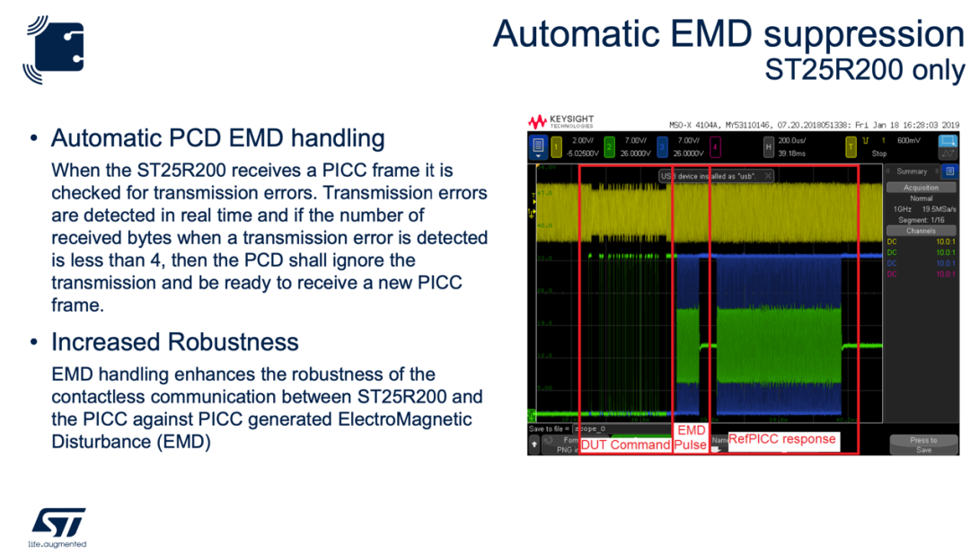 增强系统稳定性:EMD处理增强了ST25R200和PICC之间的非接触式通信对PICC产生的电磁干扰(EMD)的鲁棒性。