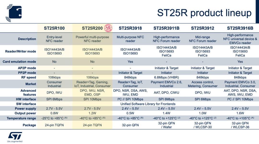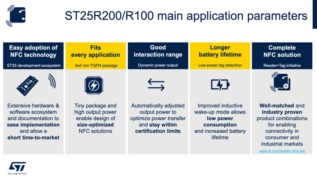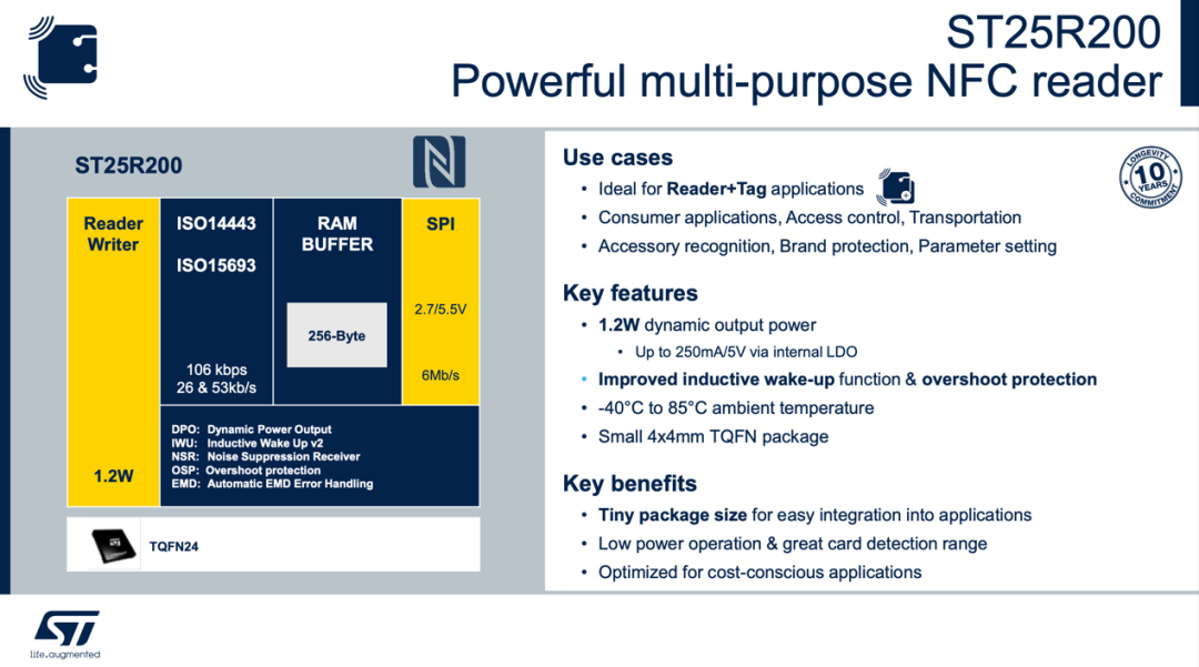 ST25R100和ST25R200 NFC读卡器封装小巧,可与任何应用无缝集成;用途多样、经济高效,针对消费和工业应用进行了优化,并提供长达10年的供货计划,是长期医疗和工业应用的理想选择。