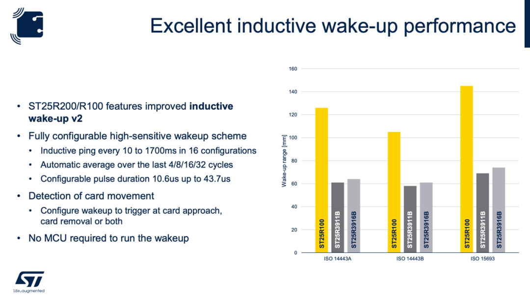 低功耗卡片检测(LPCD - Low Power Card Detection)技术:ST25R200/R100在感应唤醒功能上进行全新升级,支持全面配置的高灵敏度唤醒方案,低功耗检卡距离可以达到正常检卡模式水平,且整体检卡距离表现非常出色。