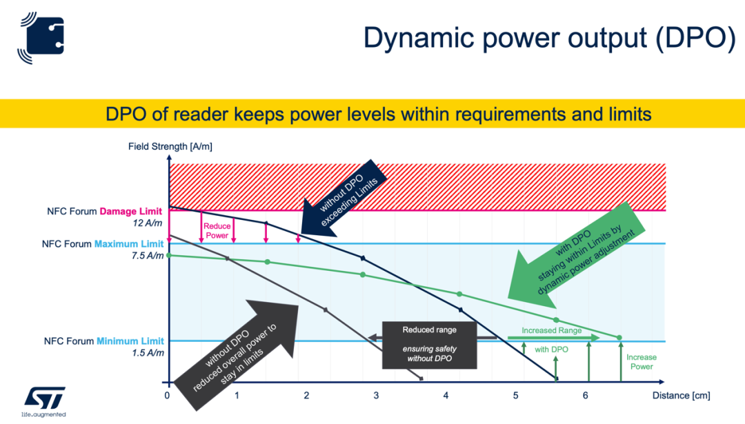 动态功率输出(DPO):能够自动调整芯片输出功率,使信号场强保持在规范限制之内,以优化效率和读写距离。ST25R200/R100的动态功率输出具有更大的调整范围和更精细的调整精度,可帮助用户产品轻松通过NFC认证测试。
