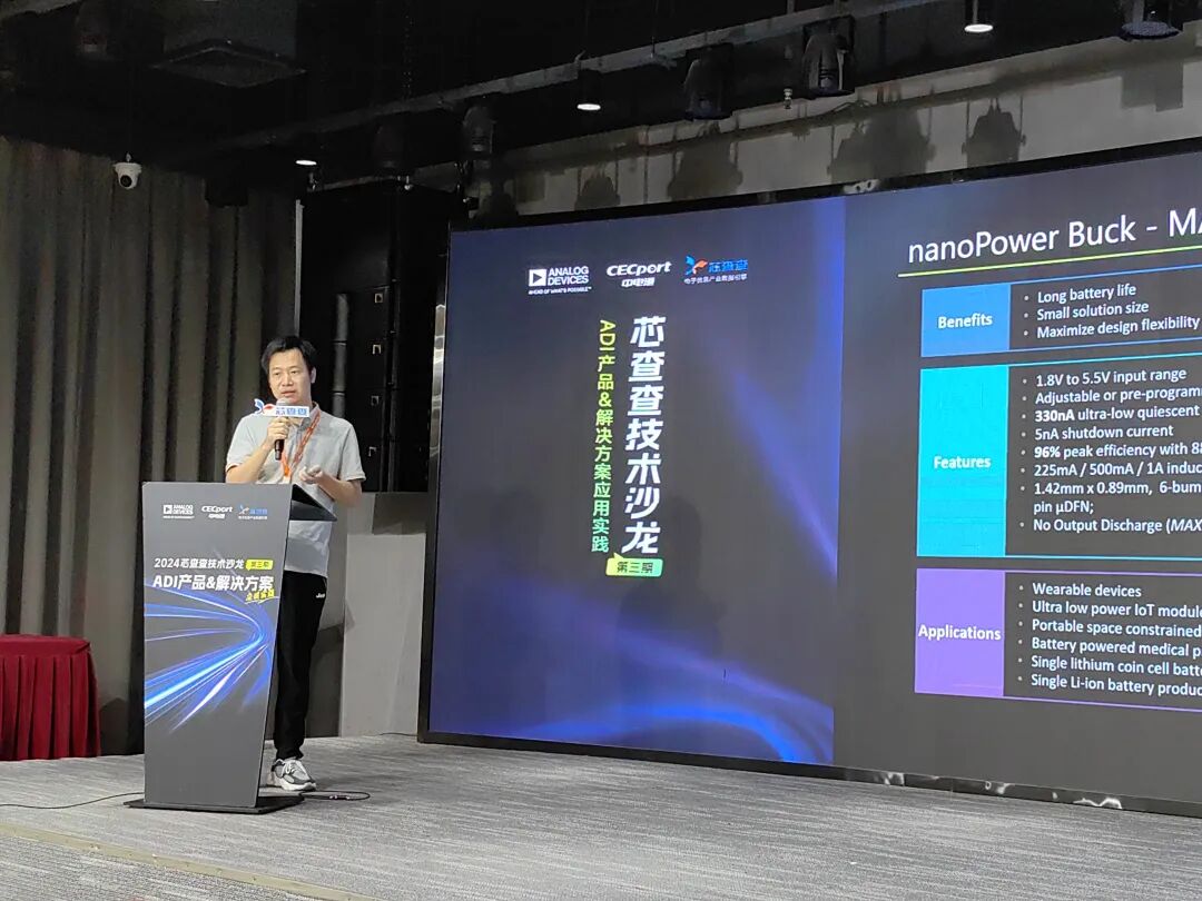 最后,作为电源产品最全的厂商之一,中电港资深FAE李根Lester先简要介绍了ADI不同种类的电源芯片及模块产品,其中重点介绍了36V降压转换器MAX42403、Silent Switcher架构电源芯片LT8641A、低静态电流nanoPower降压芯片MAX38640/1/2/3和升压芯片MAX1722X、双向电源产品LTC7872、超级电容充电芯片MAX38890等。