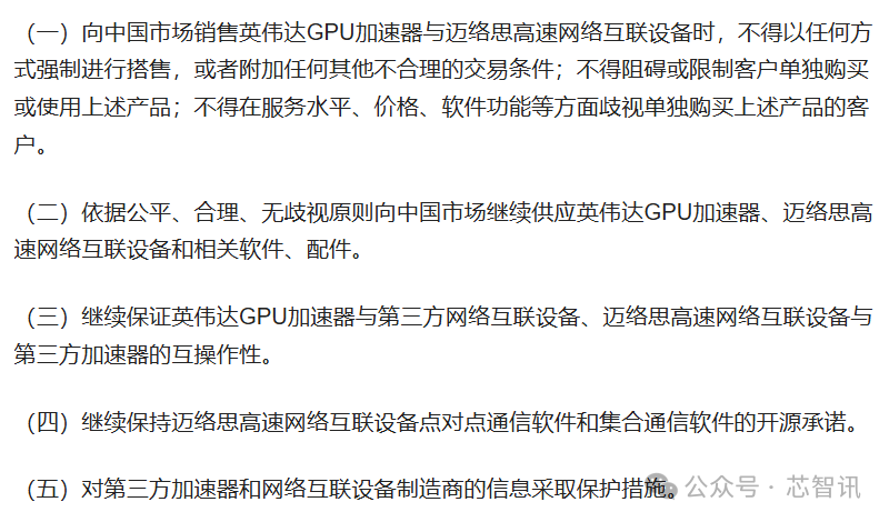 根据附加限制性条件承诺方案,NVIDIA在中国销售产品时,不得强制要求捆绑销售,例如采购NVIDIAGPU产品的条件是必须连带采购Mellanox产品,不提供其他可选的同类解决方案。
