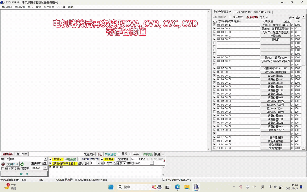 第六步,此时电机仍是堵转的状态。如演示,再次读取CVA,CVB,CVC和CVD。堵转情况下回读的值0x001B(最大值)和0x0000(最小值),换算过来低值为0.35V(最大值)和0V(最小值),和示波器测试基本一致。