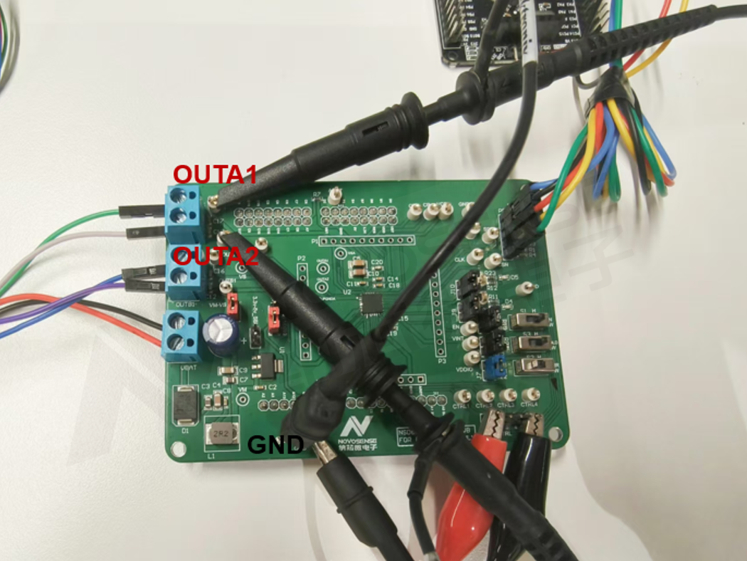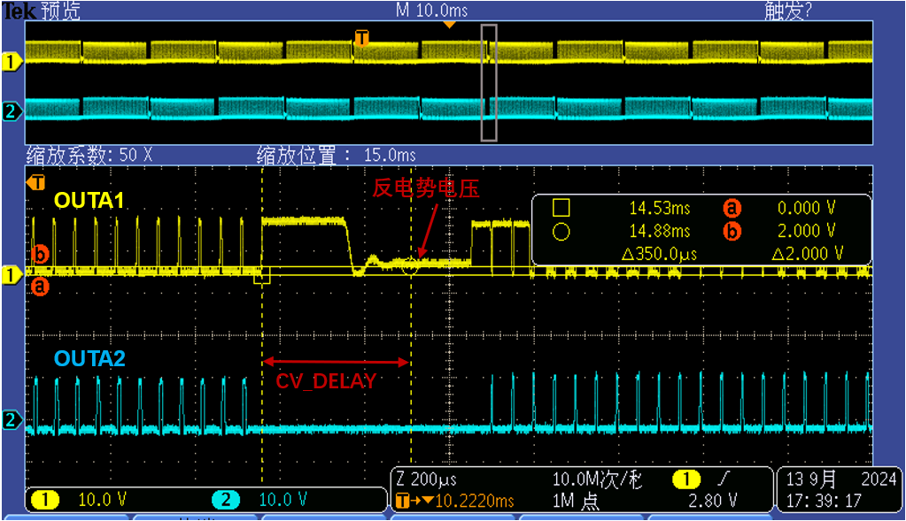 当电机转动起来后,用示波器测试OUTA1、OUTA2或者OUTB1、OUTB2对地的波形,即测量电机绕组两端的电压,记录此时的反电势值以及需要设置的CV_DELAY值。