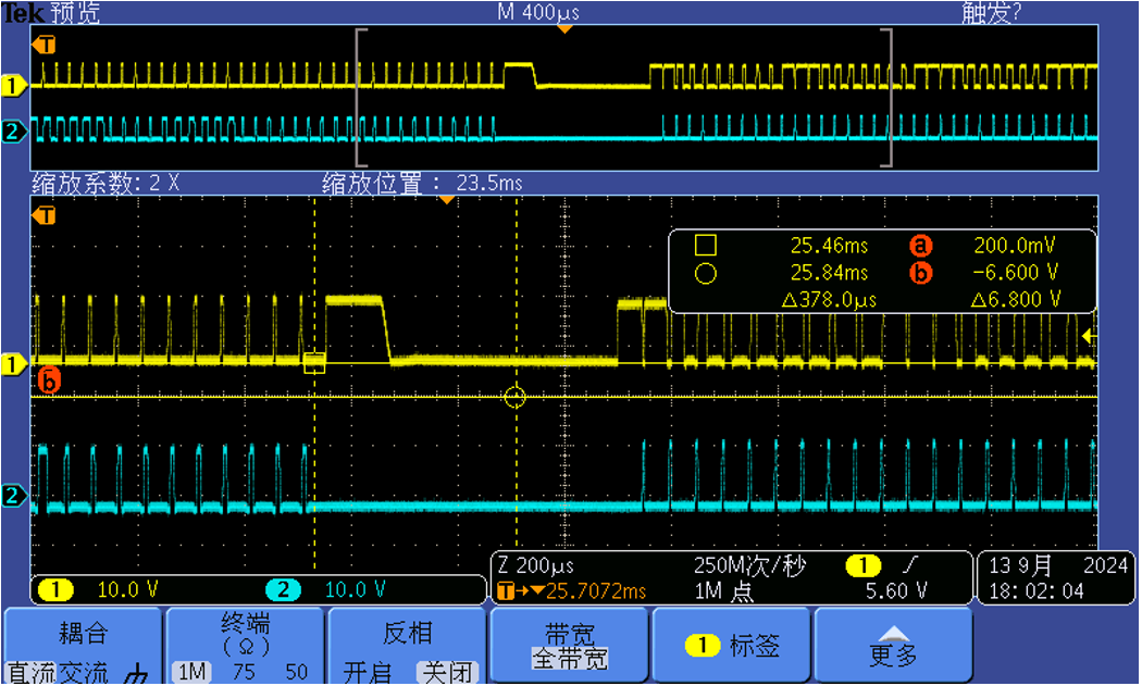 第五步,让电机堵转,同步骤二,再次测量OUTA1对地和OUTA2对地的波形。如波形显示,反电势电压显示0V。