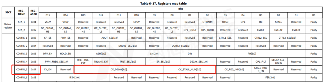 CV_DELAY[4:0]是线圈BEMF反电势电压转换延时配置位,可配置从1到31的值,对应了从零开始的PWM周期数延时,该延时之后,线圈反电势电压开始转换。步骤二测试的CV_DELAY即为该配置的参考值。如果该值为0,则在零电流结束时,进行电压采样,适用于转速比较快的电机。