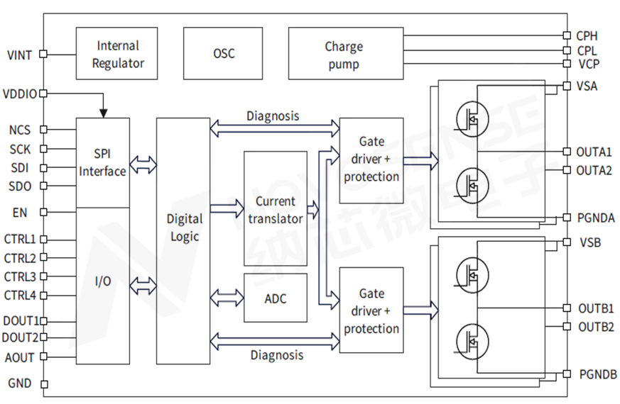 NSD8389是纳芯微最新发布的车规级双相双极性步进电机驱动,适用于汽车头灯步进控制、热管理系统电子膨胀阀驱动、HUD位置调节等应用场景。其优势是提高了步进电机的电流,支持到1.5A;提高了电机控制的微步数,支持256细分模式,增加更多衰减模式,支持8种decay模式。集成母线欠压保护,过流保护,过温保护,负载开路诊断和过流保护等多种保护功能。同时也支持堵转检测功能,适用于对步进电机精度要求更高的场合。