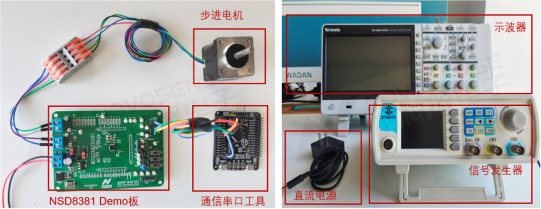 NSD8381 demo板、步进电机、通信串口工具、12V直流电源、示波器、信号发生器、串口发送上位机界面。
