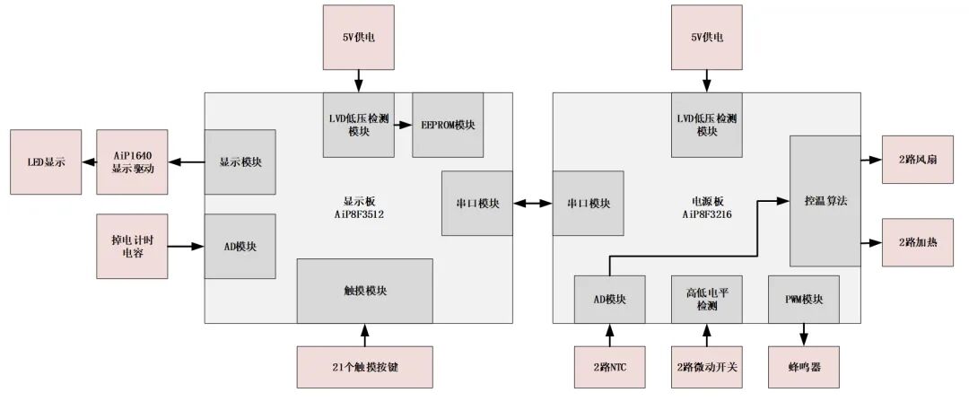 根据市场调研,市面上多数双锅空气炸锅均采用全触控操作方式,常规的一个MCU+显示驱动的方式不足以满足多按键操作,故而本方案采用显示板+电源板双MCU的解决方案。其中显示板用来检测触摸按键、驱动LED显示、检测掉电电压以及发送指令给电源板MCU,显示板MCU采用中微爱芯AiP8F3512芯片,AiP8F3512是一款低功耗触摸型8051内核MCU,内置16KB FLASH ROM、1KB XRAM、256B IRAM、128B EEPROM、内部集成Timer0/1/2/5、UART和TOUCH,12bit-ADC,最多支持26路触摸通道,芯片资源丰富、功能强大,开发省力便捷;显示板显示驱动芯片采用我司的AiP1640芯片,AiP1640是一种两线串口共阴极8段16位LED驱动控制专用电路,内部集成有MCU数字接口、数据锁存器、LED高压驱动等电路,本产品性能优良、质量可靠,主要用于小家电产品的显示屏驱动;电源板根据显示板下发的指令控制加热、风机运转、蜂鸣器以及检测锅内温度和抽锅状态并将信息上传显示板,电源板MCU采用中微爱芯AiP8F3216芯片,AiP8F3216是一款低功耗8051内核MCU,内置16KB FLASH ROM、1KB XRAM、256B IRAM、128B EEPROM、内部集成Timer0/1/2/5、UART和TOUCH,12bit-ADC,满足客户需求。