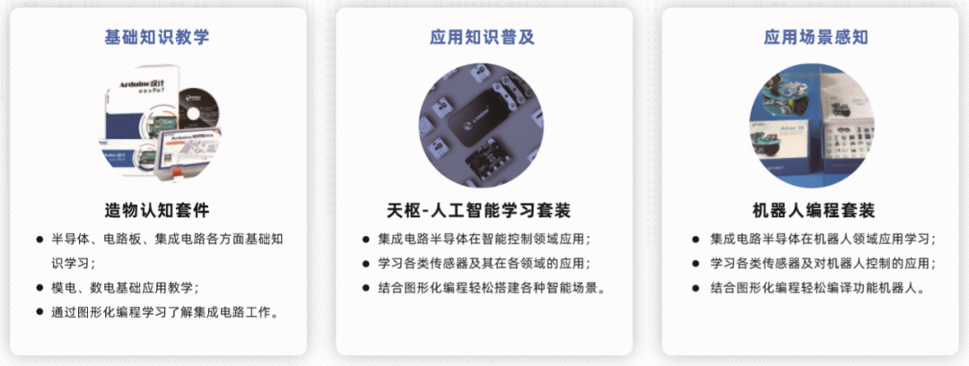 “小平实验室”结合中学生学段的认知水平,立足于从增强对集成电路半导体产业基础的感性认知出发,通过动手实践,到最后完成相关应用项目,设计了科学合理的实验室区域设计方案和进阶型课程配置。