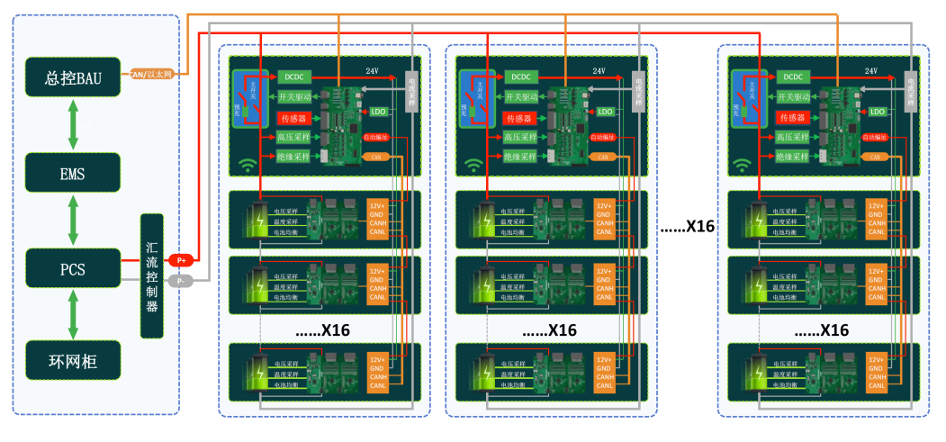 第三个优势是支持灵活扩展架构。该方案可在二级架构和三级架构之间灵活切换,BCU 与 BMU 设备数量支持自由配置,单个BCU最多可连接16个BMU,充分满足1500V系统的实际应用需求。