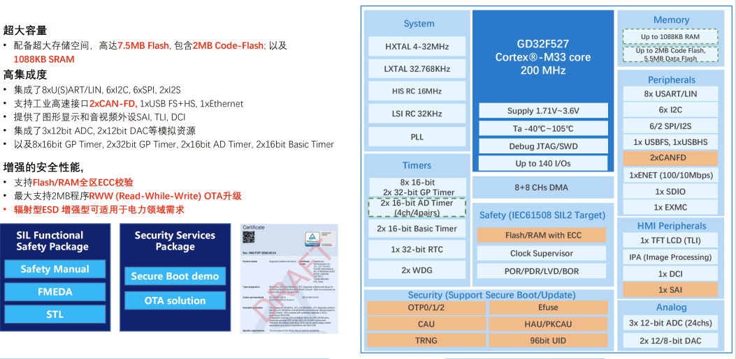 在可靠性设计上,该芯片采用增强型ESD防护方案,不仅满足工业与能源领域的常规 ESD 要求,更能应对电力场景中严苛的辐射型 ESD 挑战。值得一提的是,GD32F527已通过 IEC 61508功能安全认证,兆易创新的安全工程师团队可协助客户将 STL 软件库嵌入主代码,据实测经验,这一支持能为客户节省 60%-70%的功能安全认证研发时间。此外,芯片提供多种封装选项,灵活适配不同形态的终端设备。