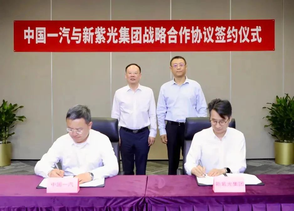 根据协议,新紫光集团将与中国一汽在国产芯片应用、供应链资源建设、联合技术攻关、产业生态建设、市场互助合作等多维度展开战略合作,共同构建覆盖芯片设计、晶圆制造、封装测试、选型应用及系统化解决方案的车规级芯片产业生态,着力打造“芯片+汽车”合作的行业标杆。对于此次深化合作,双方领导均给予高度评价。新紫光集团作为覆盖半导体到数字经济全产业链的智能科技产业集团,中国一汽作为销量规模位列国内第一阵营的国有特大型汽车企业集团,双方的合作具有重要战略意义。未来,希望双方充分发挥各自在汽车、芯片及信息与通信技术等领域专业优势,强强联手、互利共赢,携手推动国产新能源智能汽车产业创新发展、加速变革。本次签约仪式上,中国一汽高巍、孙惠斌、周时莹、赵斯亮,新紫光集团黄钧、黄宇宁、樊建勋、严竹、何明等相关负责人一同出席了活动。